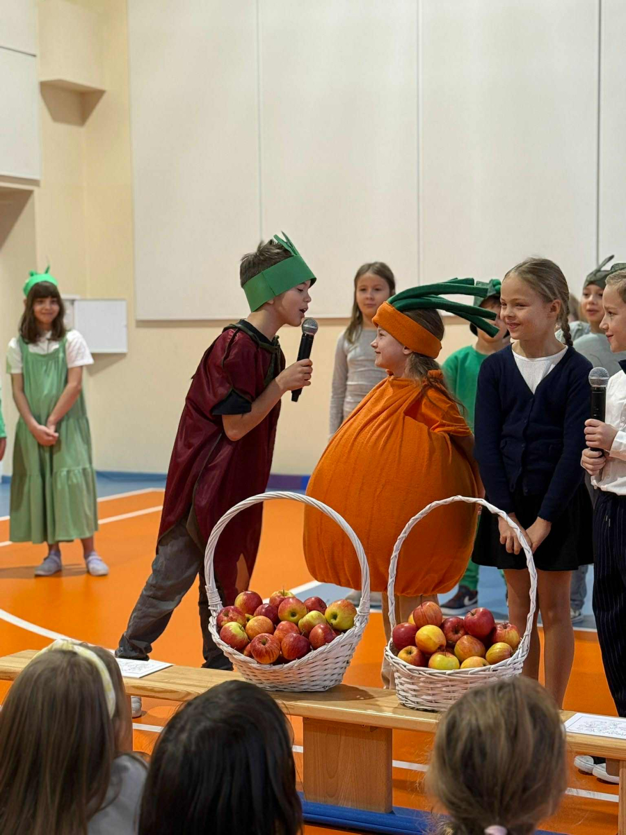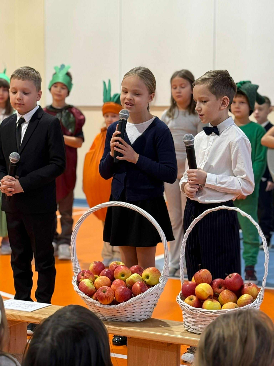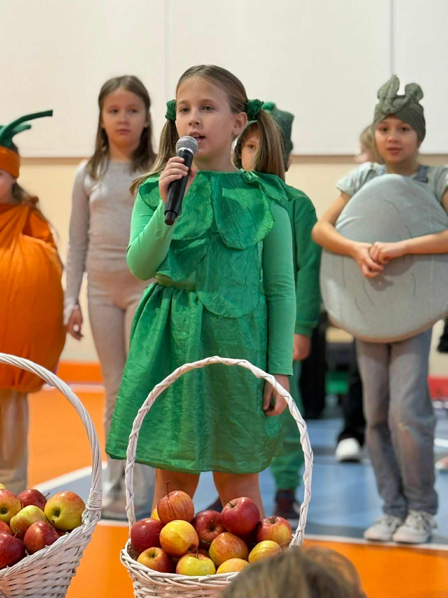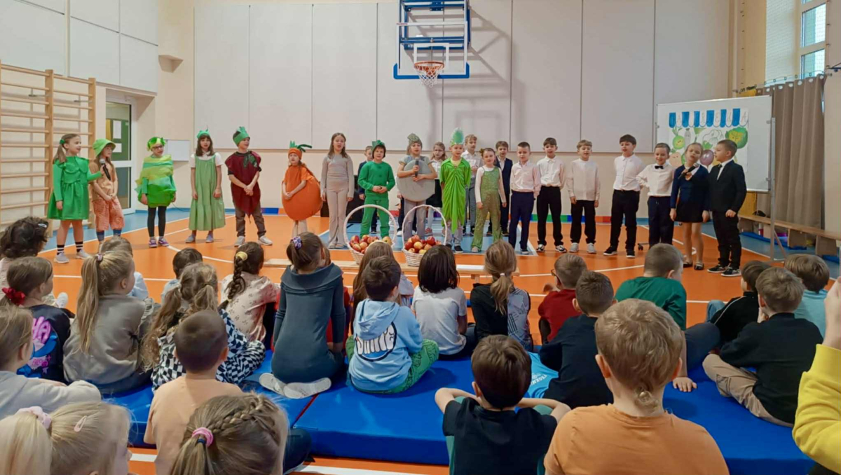 Na zakończenie spotkania pierwszaki mogły sprawdzić swoją wiedzę w krótkim quizie warzywnych zagadek. Poradziły sobie z nimi znakomicie, za co otrzymały w nagrodę pyszne jabłka oraz kolorowanki związane z tematyką przedstawienia.
